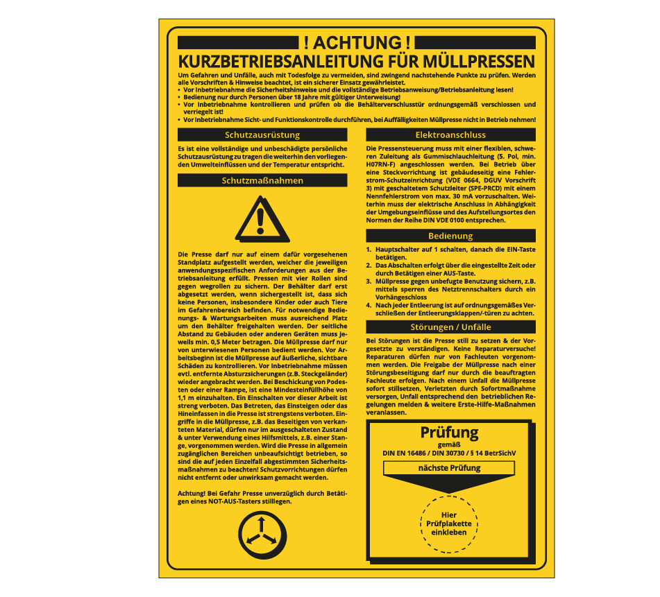 PVC Aufkleber "Kurzbedienungsanleitung für Müllpressen"210x297mm