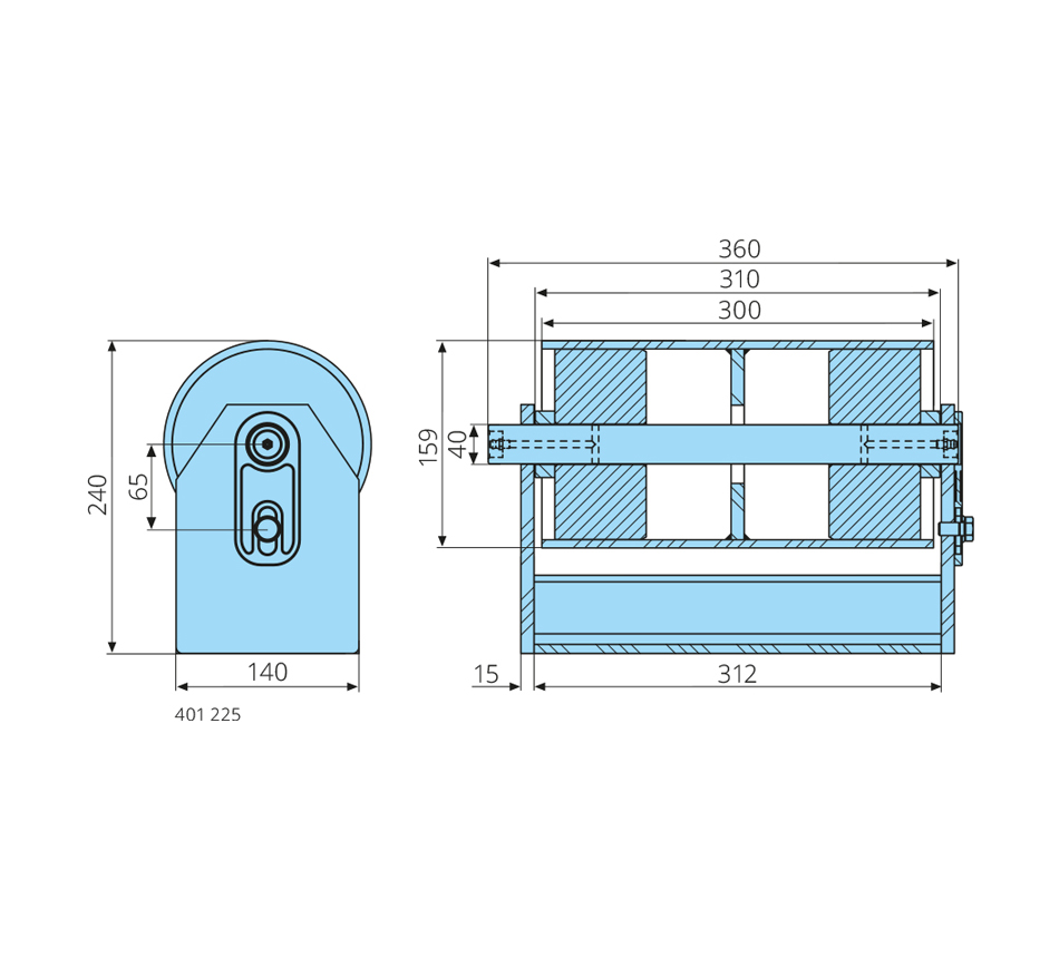 40-159-300/310mm, H=240mm, Achsschmierung, mit Mittelscheibe & 2 Einschweißbuchsen