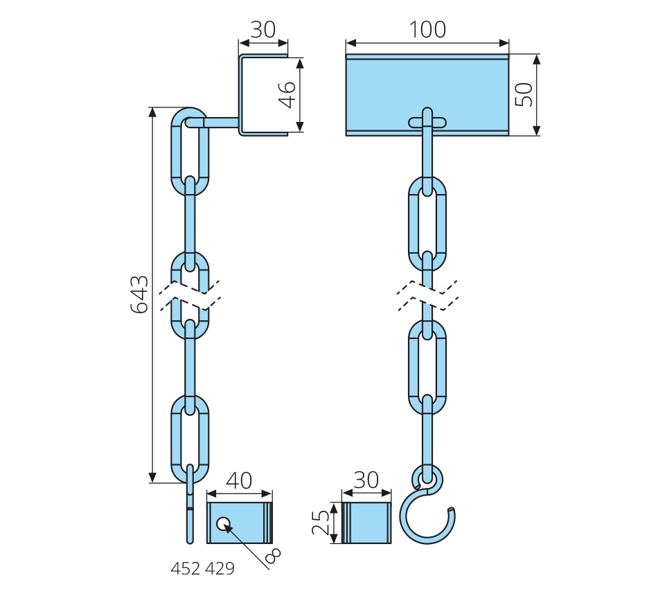 Sécurité du couvercle46x100mm, L=643mm, galvanisé, avec équerre pour accrocher, pour couvercles à ressort