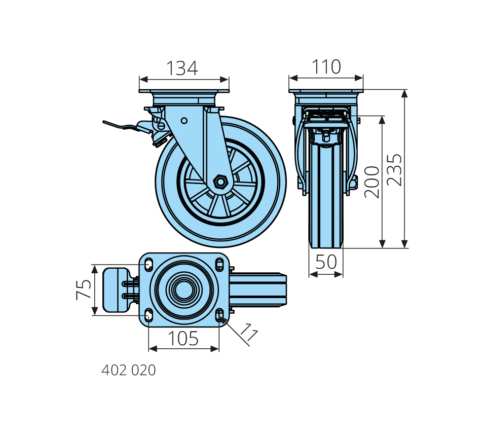 200x45mm, dynamic load capacity 210kg, solid rubber tyre, plastic hub, plain bearing, with brake, maximum speed 4km/h