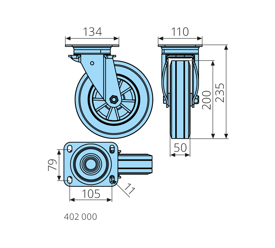 200x45mm, dynamic load capacity 210kg, solid rubber tyre, plastic hub, plain bearing, maximum speed 4km/h