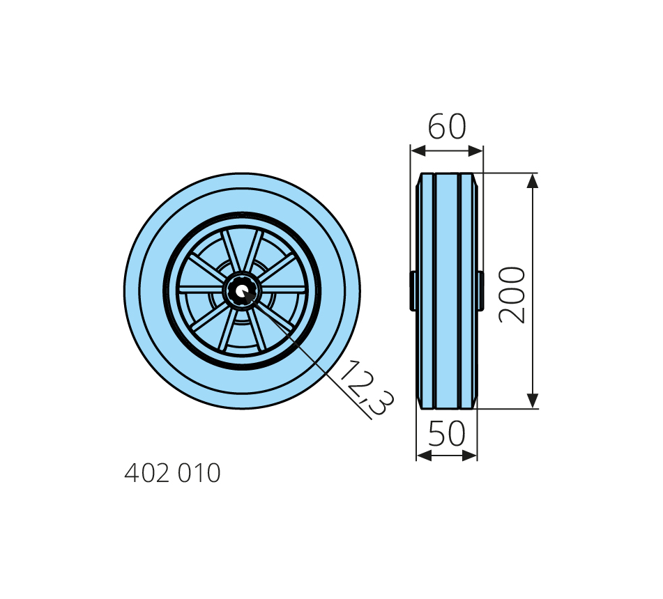 200x45mm, dynamic load capacity 210kg, solid rubber tyre, plastic hub, plain bearing, plastic sleeve, maximum speed 4km/h