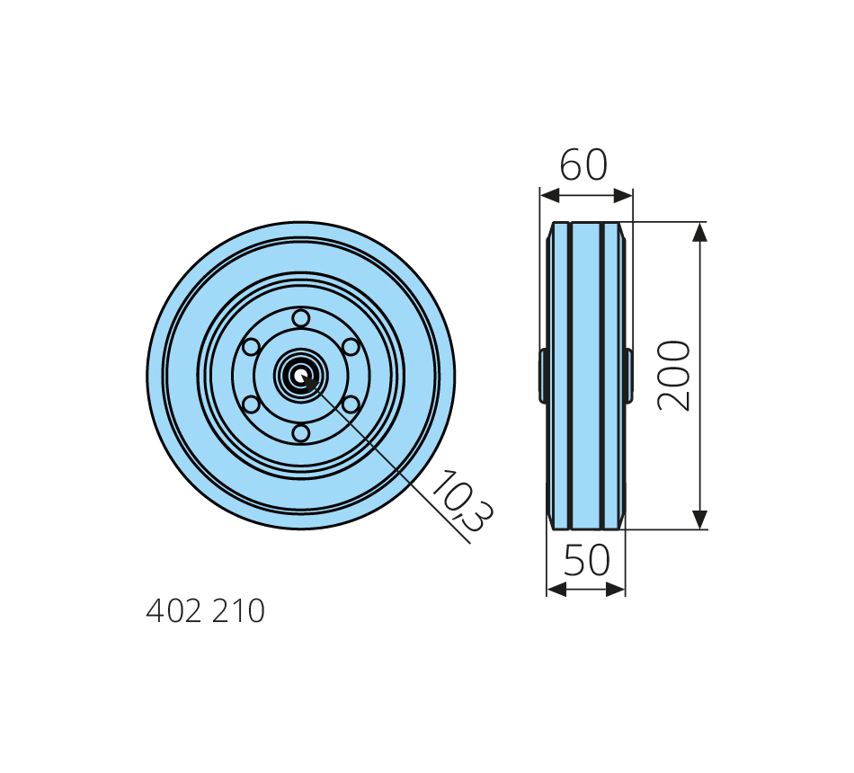 200x45mm, dynamic load capacity 330kg, solid rubber tyre, steel hub, roller bearing, steel bushing, maximum speed 4km/h