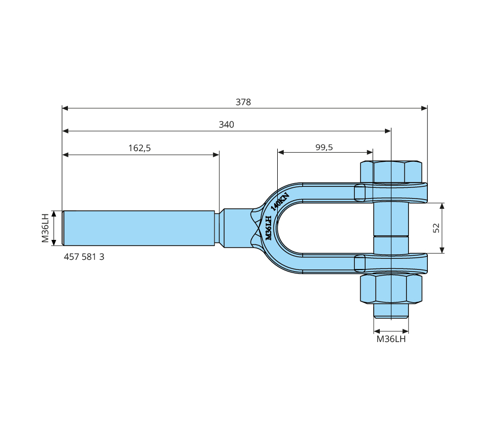 M36x378mm, left-hand thread, galvanized, forged, with bolt and nut
