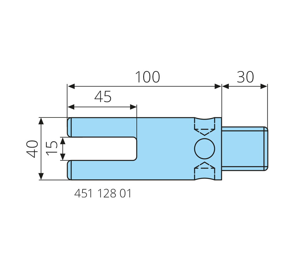 D=40mm, L=100mm, slot 15x45mm, square 28x28mm