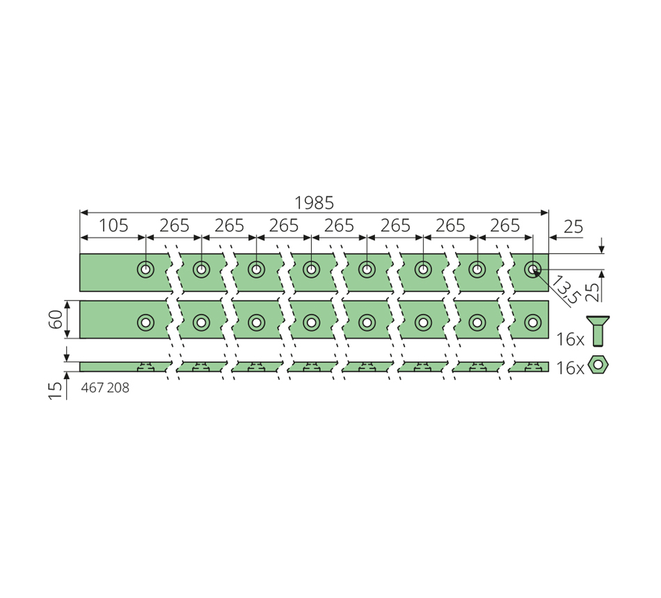 jeu rails de glissement 60x15x1985mm, 42CrMo4, 2 parties (gauche/droite), avec vis & écrous, type PAAL
