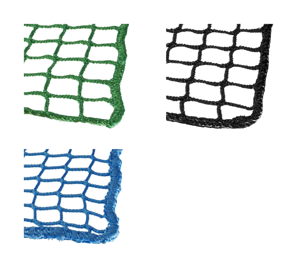 Filet à mailles fibres synthétiques PPpour benne de 30-40m³, 3,5x8m, 200g/m², 3mm, maille 30mm, vert, bleu ou noir