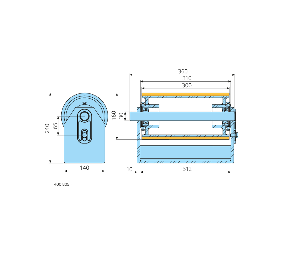 30-159-300/310mm, H=240mm, load capacity 8t, tread polyurethan coated, ball bearing