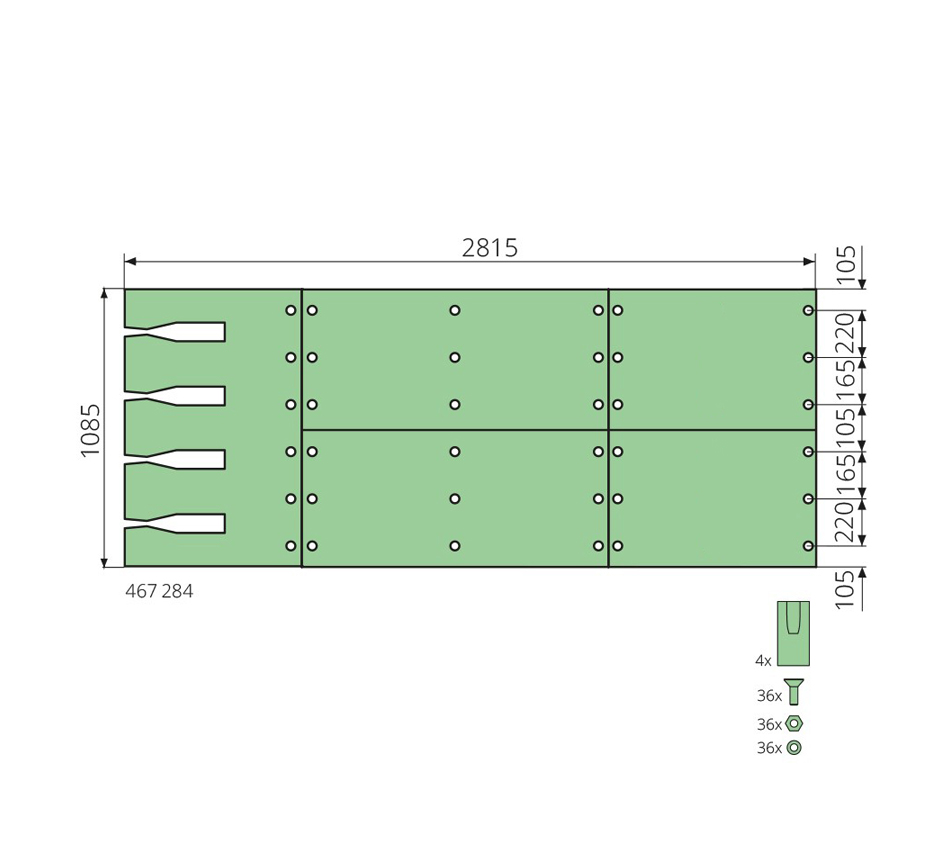 2815x1085mm, HARDOX 450, 36x vis, 4x panneaux à rainures, type PAAL