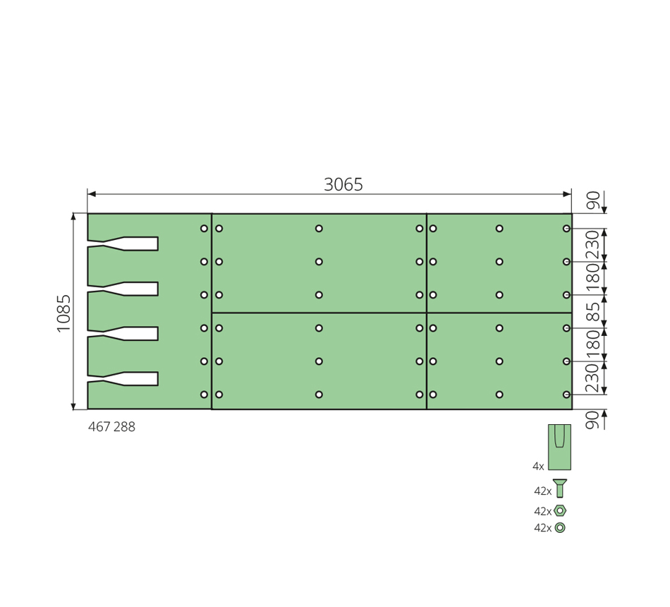 3065x1085mm, HARDOX 450, 42x vis, 4x panneaux à rainures, type PAAL