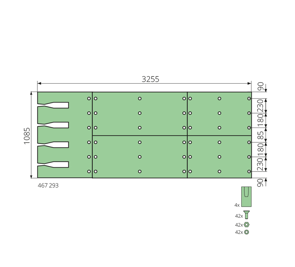 3255x1085mm, HARDOX 450, 42x vis, 4x panneaux à rainures, type PAAL