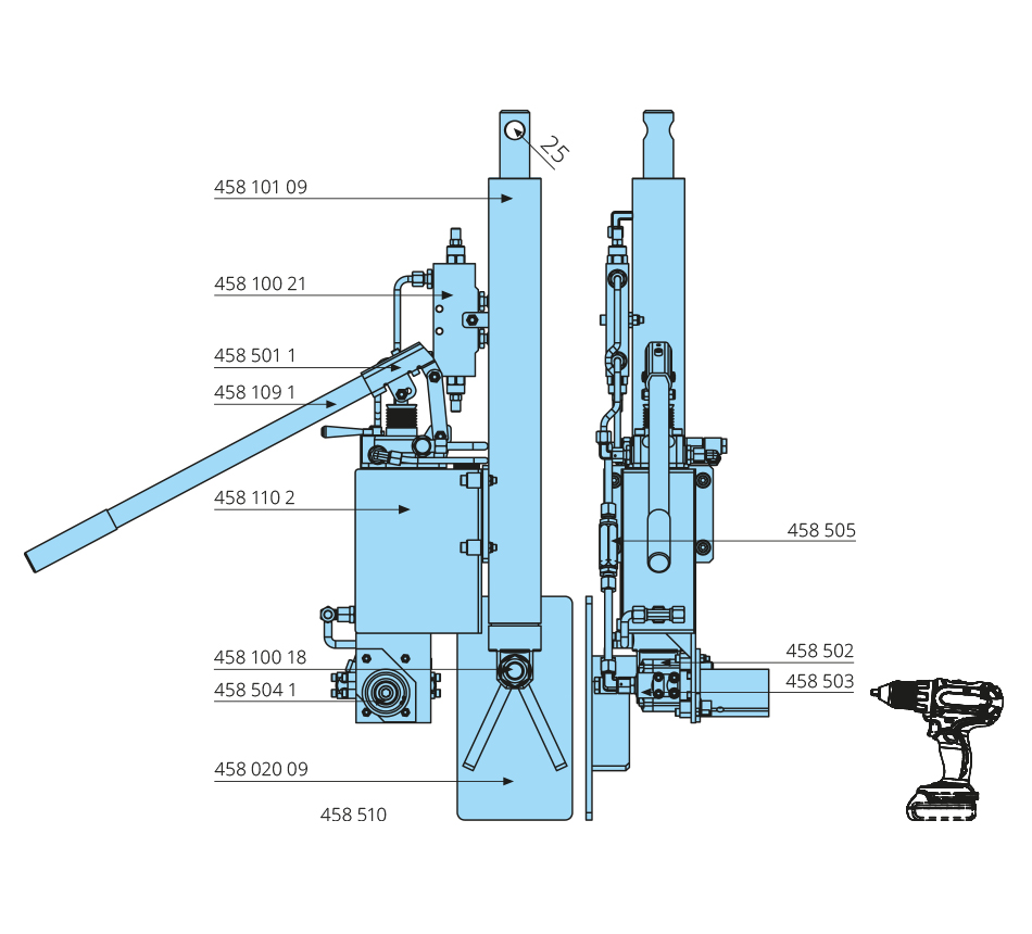 stroke 500mm, mounting right, frontal adapter, double-acting, 25cm³, without cordless drill