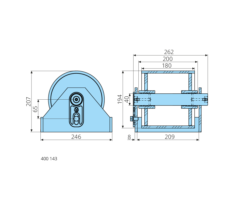 Steel roller complete40-194-180/200, H=207mm, with lubrication and brass bushings, shaft screwed, primed