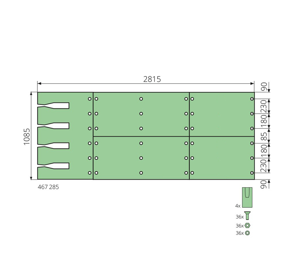 2815x1085mm, HARDOX 450, 36x vis, 4x panneaux à rainures, type PAAL