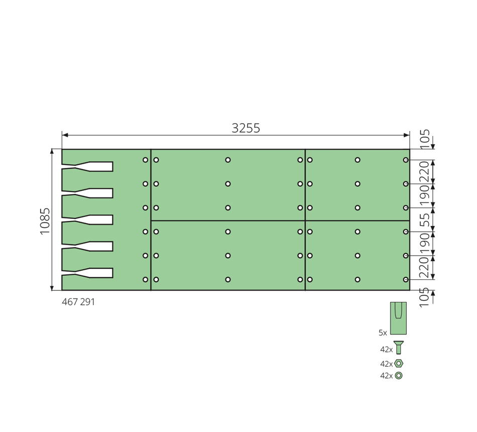 3255x1085mm, HARDOX 450, 42x vis, 5x panneaux à rainures, type PAAL