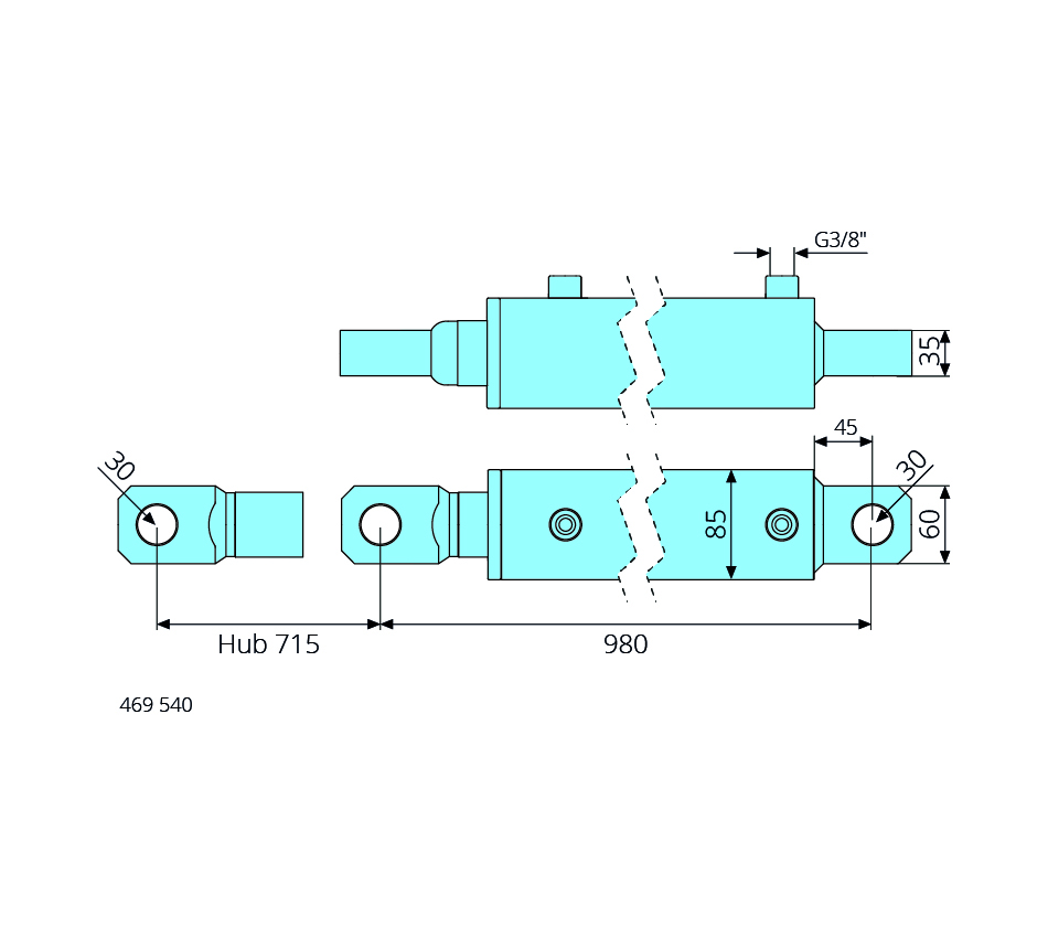 Cylinder, Hub 715mm, double-acting, 250bar, 18S, primed, Typ DIXI