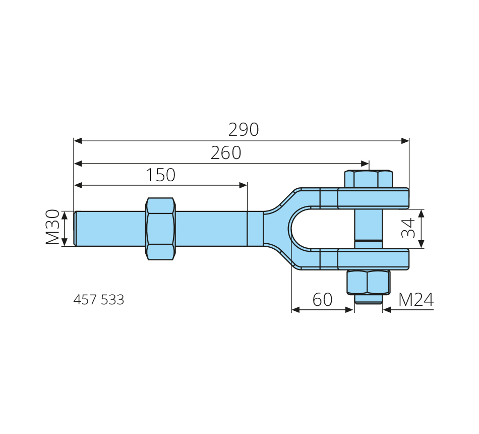 Chape filetéeM30x290mm, filet à gauche, galvanisé, avec boulons & écrous