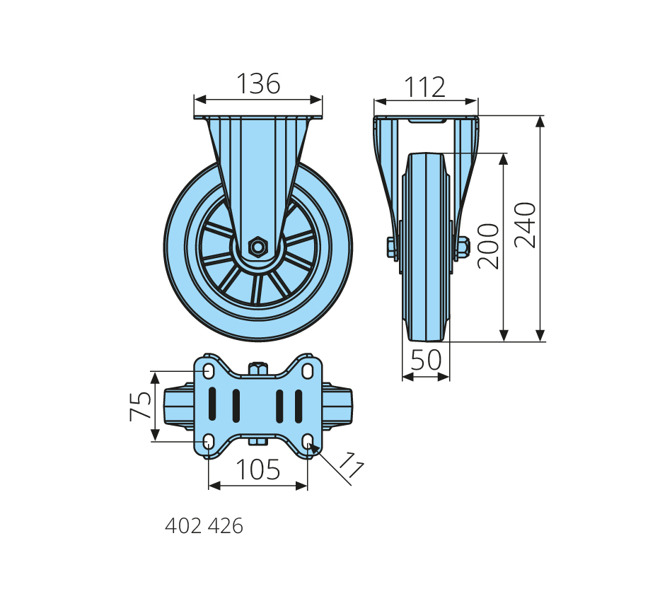 Roue fixe200x50mm, charge dynamique 500kg, bandage caoutchouc élastique, jante aluminium, roulement à billes
