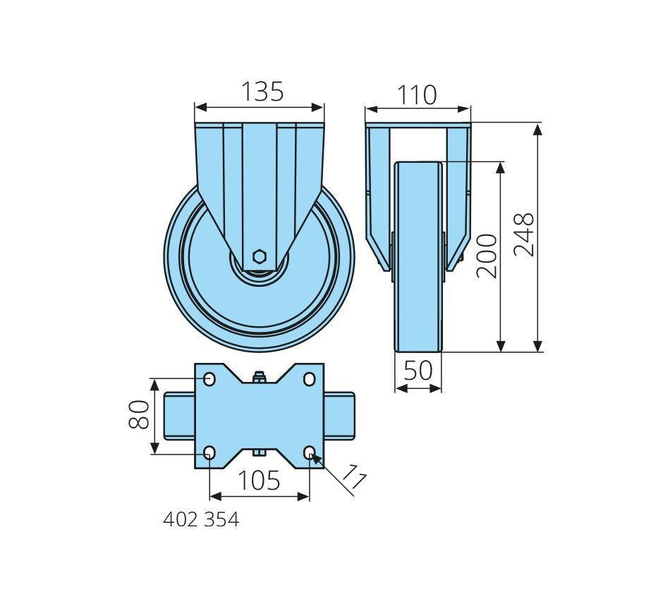 200x50mm, ,capacité de charge 1000kg, bandage polyuréthane, jante acier moule, vitesse maximale 4km/h