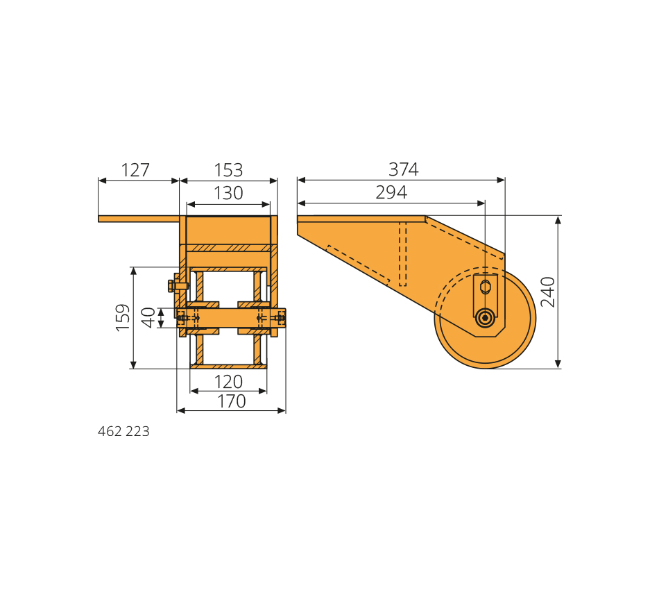 Rouleau avec bâti40-159-120/130mm, droite, lubrification de l'axe, douille laiton, type HUSMANN