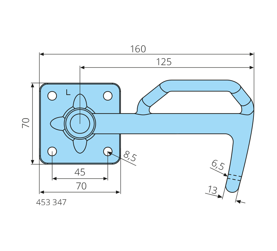D=13mm, left, size 1, hook L=125mm, plate 70x70mm, galvanized