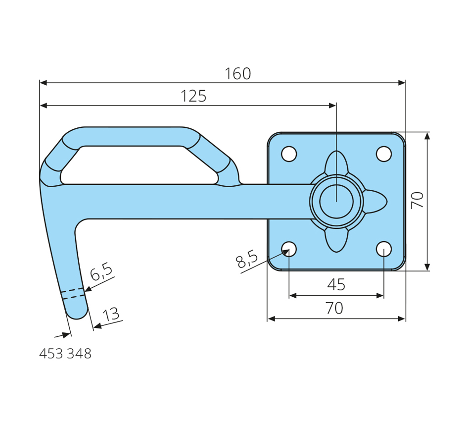 D=13mm, right, size 1, hook L=125mm, plate 70x70mm, galvanized