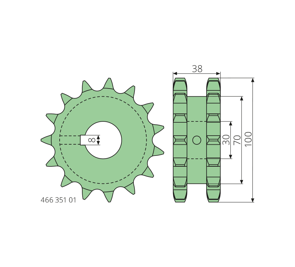 Pignon à chaîne duplex30-100-38mm, 15 dents, alésage avec rainure, type BOLLEGRAAF