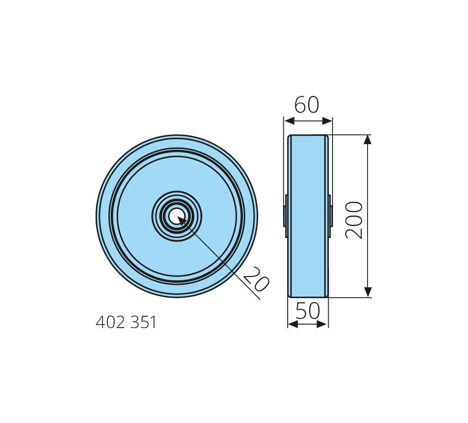 200x50mm, dynamic load capacity 1000kg, polyurethane tyre, cast iron hub, ball bearing, maximum speed 4km/h