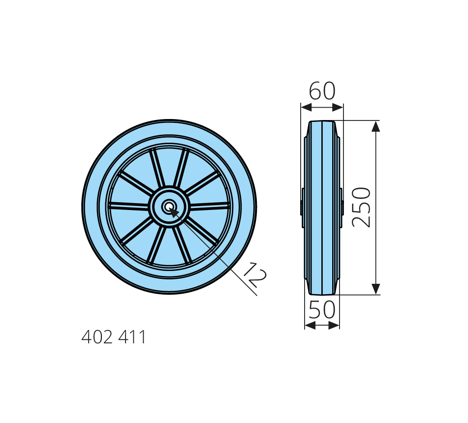 250x50mm, dynamic load capacity 500kg, elastic rubber tyre, aluminum hub, ball bearing, 2 collar sleeve, maximum speed 4km/h