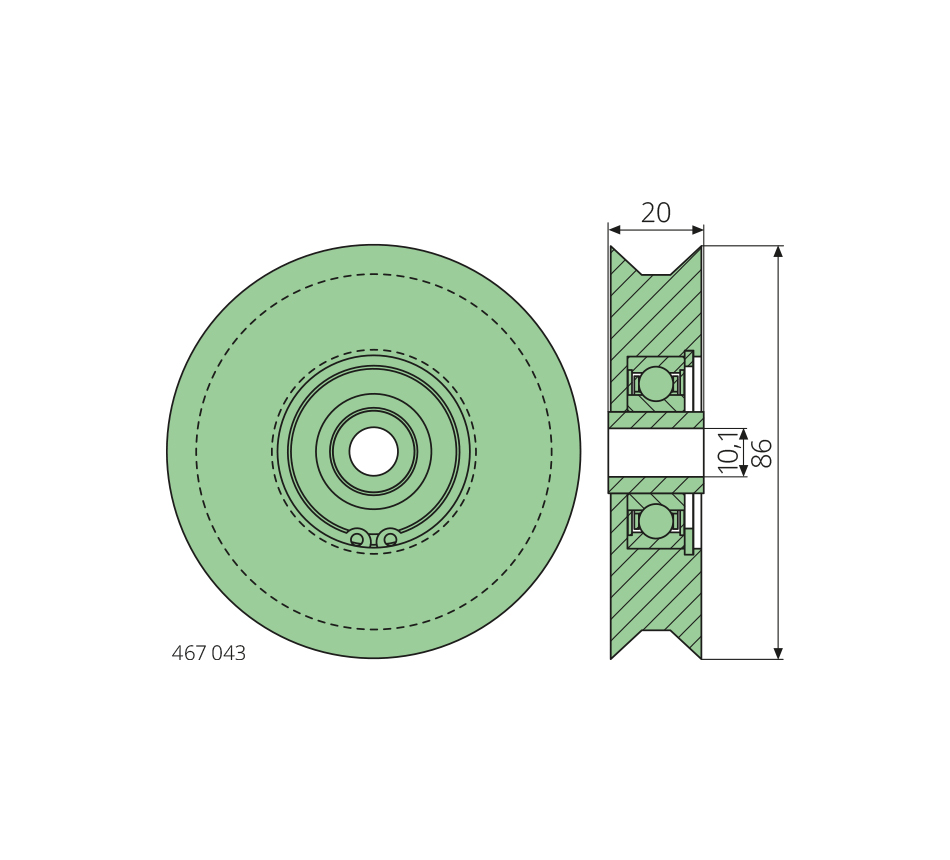 10,1-86-19mm, S355J2, with bearing, circlip & bushing, type PAAL, mount for roller 467 110 /-100